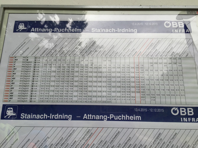 从公寓出来走200米坐U6地铁,三站到维也纳火车西站(Westbahnhof)。去Hallstatt的火车一天15班,基本每小时一趟。先坐到Attnang-Puchheim ,下车后原地不动,有城市通勤火车(City Shuttle)接驳到哈尔施塔特(Hallstatt),全程大约4小时。