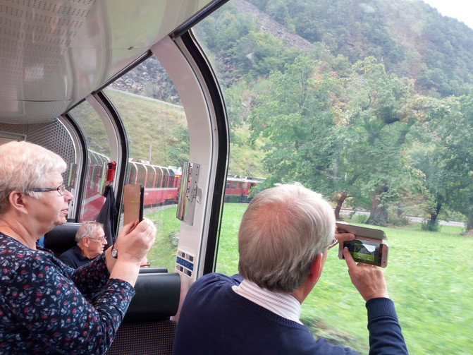 苏黎世中央火车站去切莱里那的火车每小时一班。我们坐的是14:37开车的TIC 573次,在CHUR(库尔)换世界文化遗产瑞士冰川特快去切莱里那。 我非常喜欢火车旅行,尤其国外的“观光火车”,即是交通工具,又是旅游项目,一举两得。这列著名的冰川列车是世界上最慢的特快列车,车窗外的美丽风景让人忘掉15个小时飞行的旅途疲劳,无时不充满兴奋和惊奇。烟波浩淼的苏黎世湖,阿尔卑斯山的秀丽风光使人陶醉,一幕幕山、谷、 桥、湖之美景让你一饱眼福。
