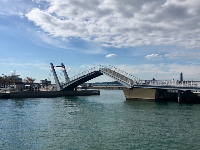 之后前往关门海峡,向大连友谊纪念馆出发。沿途可以看见蓝翼吊桥,吊桥会在一天中的固定时刻打开,供船只通行。