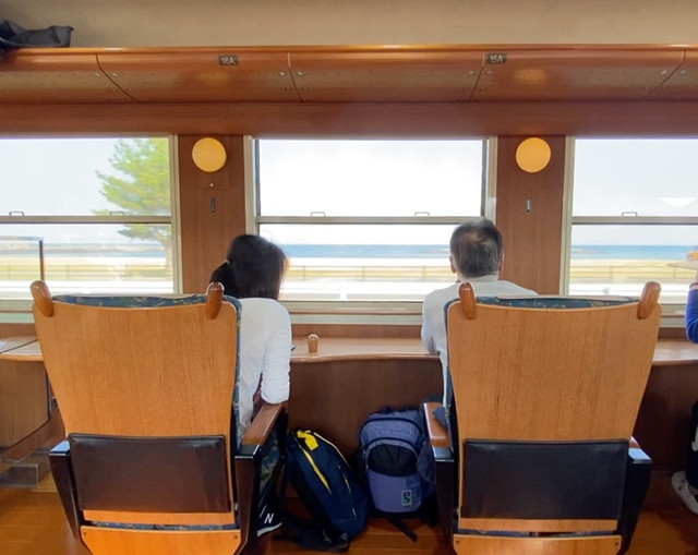 “指宿玉手箱”号沿海岸线一路悠然前进。沿途远眺锦江湾和樱岛的景观,车内还设置面朝大海的旋转座椅。