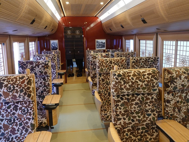 列车内部装潢随处可见九州等地的日式风情。1号和6号车厢的榻榻米地板由熊本县八代市的蔺草为原料制成。游客可脱下鞋靴放松身心,享受别样的列车旅行。此外,每辆车厢座位均配备免费无线网络服务和电源插座,体验便捷旅途。