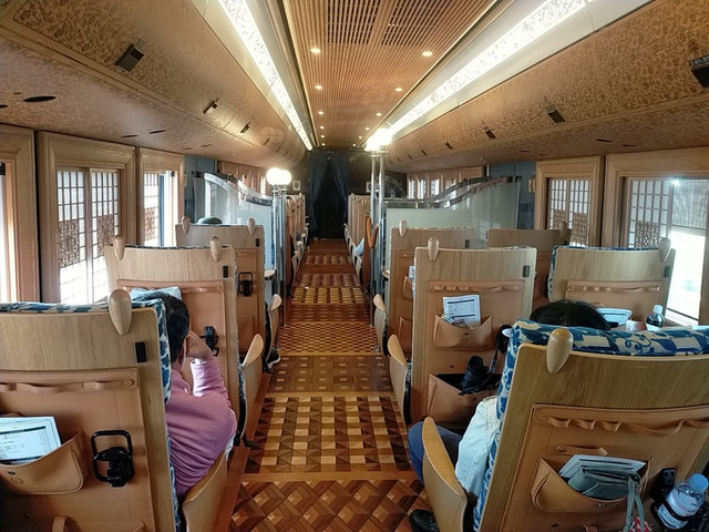 车厢大量采用木材结构,营造出温馨舒适的氛围,透过车窗九州大地的优美风景尽收眼底。