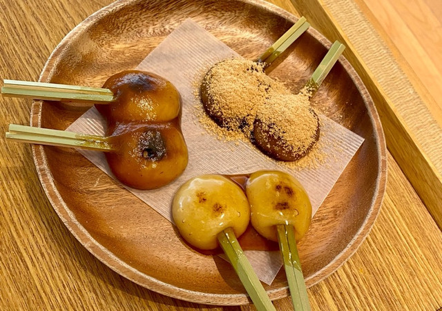 穿过花坛就到了江户风情街。这里有一种小吃叫 “两棒饼”是颇具历史的名点。相传在700年前的日本南北朝时代,怀良亲王途经鹿儿岛谷山城,看见了这种插着两根竹签的年糕,于是将其命名为两棒饼。