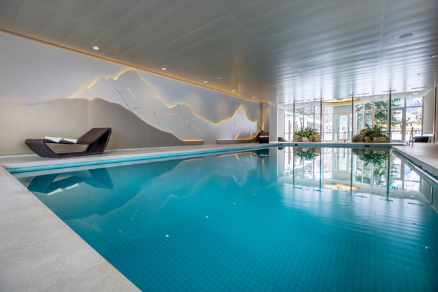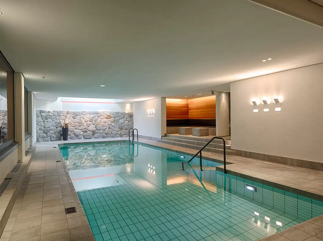 滑雪归来,躺在坐享开阔山景的室内温水泳池畔饱览白雪皑皑的山峰,何其惬意!