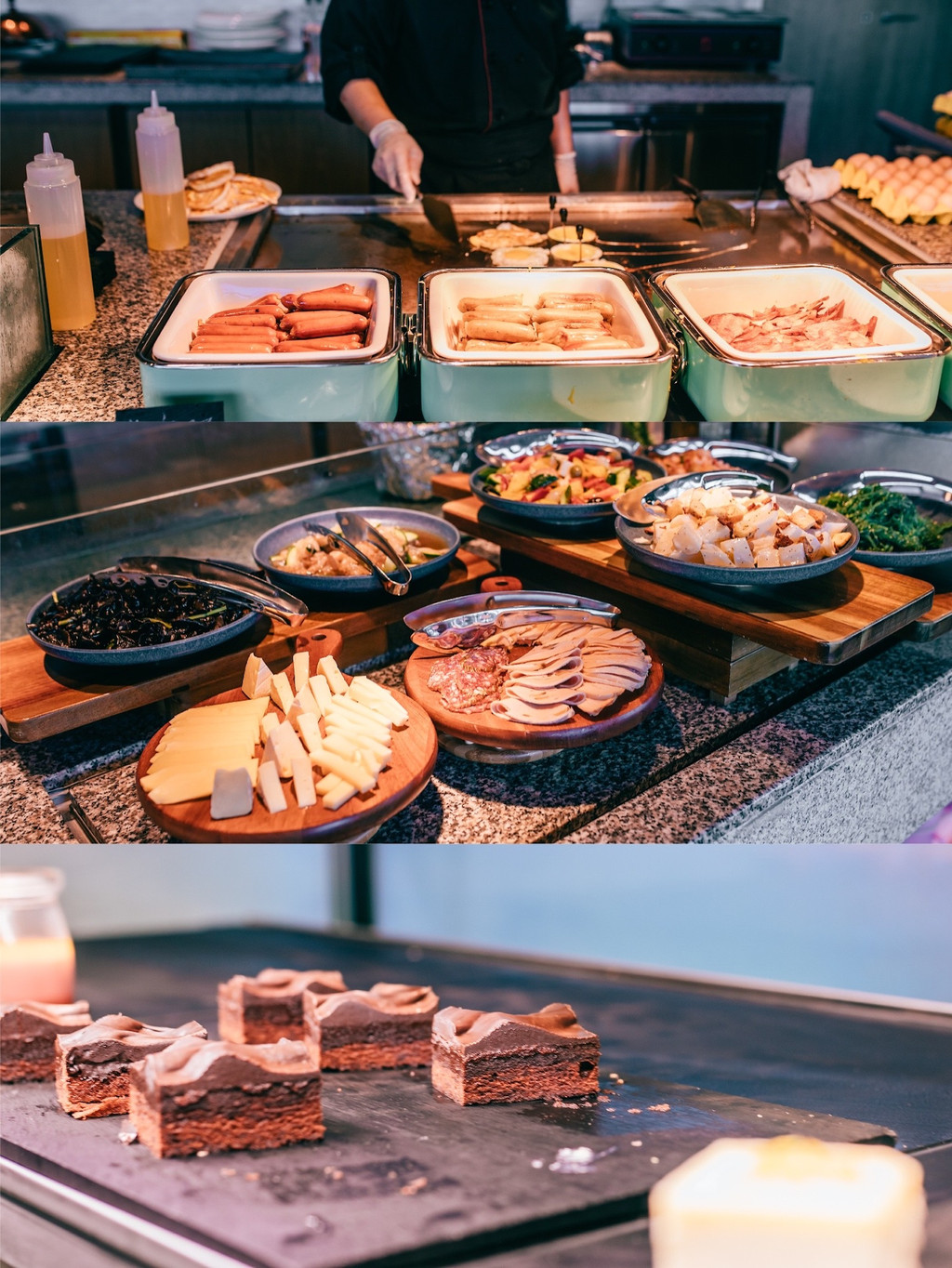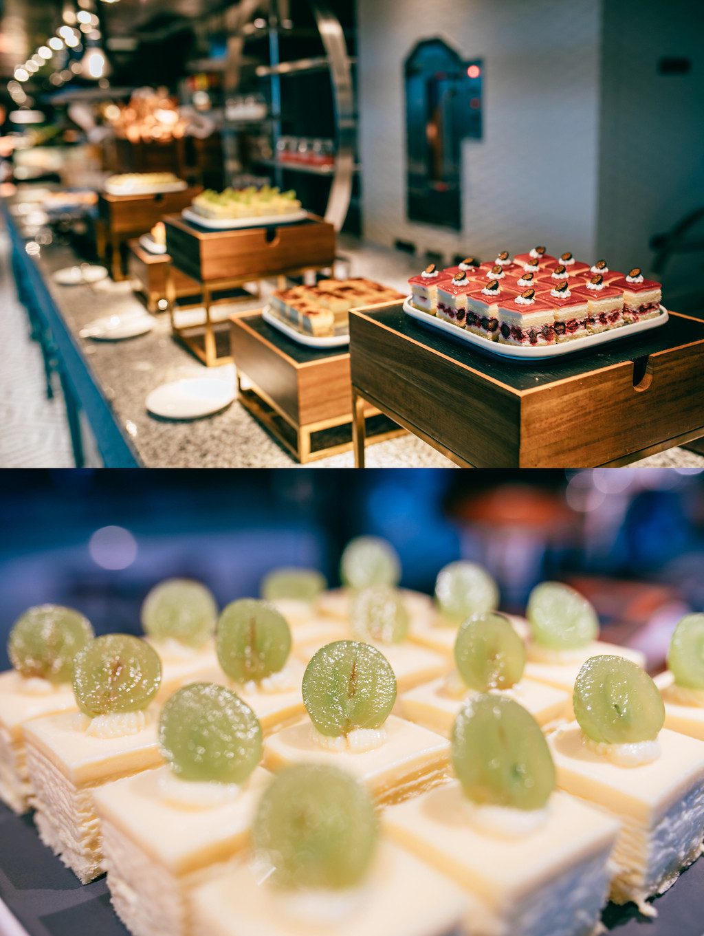 晚上的自助主题是海鲜,海陆风味可以在这里一网打尽。中西各类美食摆满10+个摊档,种类丰富到让人目不暇接,可以一站式打卡异国美食,实在太适合大胃王了!值得一提的无论是刺身、贝类、蟹腿都一律很新鲜,成了自助晚餐时最抢手的种类,简直是手慢无。墨西哥塔可与旁边的肉类小拼盘几乎是整个晚餐的颜值担当。