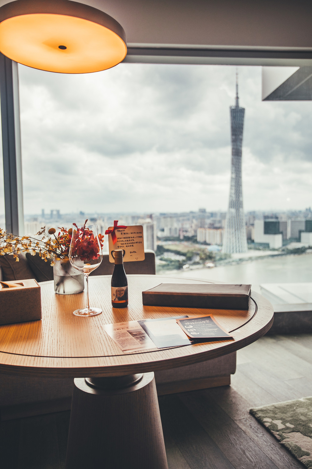 最让人惊艳的还是客房里的一整面落地窗,当自动窗帘缓缓拉开时,正对小蛮腰的江景视野也逐步显现。震撼程度不亚于进入三亚海景房看到窗外的大海时。闲来靠在沙发上看珠江两岸的美景,看着珠江两岸CBD从白天的云卷云舒到夜晚的华灯璀璨,光阴既快且慢,日升日落总在须臾之间。