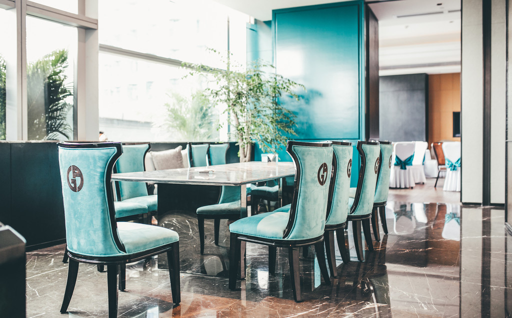 位于4F的临江阁餐厅,主营粤菜为主的中西各类美食,在广州雅致你可以在酒店足不出户,完成一场又一场的舌尖饕餮。餐厅有大堂、包厢两大区域,黑白灰色系的刚硬工业风线条,与时尚的欧式蓝、软包座椅之间可以说玩得一手好混搭。餐厅之所以叫作临江阁,是正对珠江的那一面全部用了落地窗,无论坐在餐厅哪一个角落,都以眺望窗外的猎德大桥与小蛮腰。