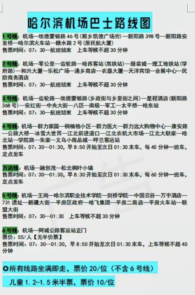 落地哈尔滨已经快24点了,虽然机场距离市区较远,但是哈尔滨机场有直达市区的接驳大巴,而且机场巴士一直运营到航班结束!也就是说,即使你半夜到,也有大巴可以坐!你可以选择人工买票,也可以通过一些在线平台买票,不用着急担心,下面附有机场巴士的线路运营表,大家可以参考哦!👇