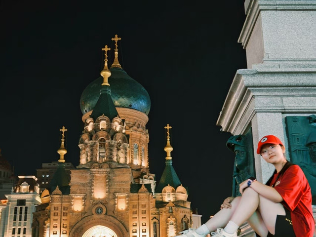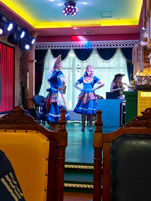 来了哈尔滨怎么能不体验一下俄式西餐文化呢,稍事歇息后,我们决定去品尝一顿正宗的俄餐,网上查到一家口碑还不错的俄餐厅:普拉维奇俄式西餐厅,这家餐厅位于中央大街,离我们住宿的酒店非常近,立马出发,步行没多远就到了,一进门还能看到几套俄罗斯风格的服饰,可以穿上它们拍照,体验一把异国风情。我们去到二楼选了一个离舞台超近的位置入座观看俄罗斯女郎表演,点了美团的套餐,然后她们开始拍照,我开始欣赏美景,不是女郎啊。一会儿餐就上齐了,不得不说,这口味还是蛮适合我的,每道菜都不踩雷,尤其是他家自酿的格瓦斯,带酒精的,口味醇香,微醺后配合着俄罗斯小姐姐的舞蹈表演还有点上头,仿佛回到了旧上海的十里洋场,让咱普通老百姓也体验了一把上流社会的纸醉金迷。饭后我们又去欣赏了一下索菲亚大教堂的夜景,夜晚的索菲亚大教堂更像是一个光彩夺目的明星,在周围建筑的掩衬下,极为耀眼,此刻拍照瞬间也感觉自己高端大气上档次了。拍完照也不早了,我们回宾馆休息,为第二天的行程养精蓄锐。