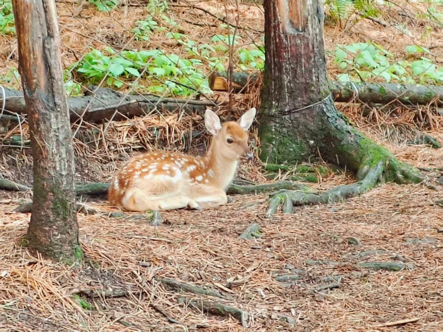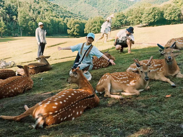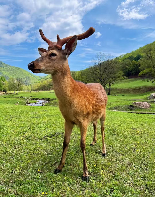 上午08:00 左右,赵师傅来酒店接上我们,开车前往伊春,车程约4.5小时;和我们家乡黄土高原多山地丘陵不一样,这里有着一望无际的黑土地,它不仅是中国的宝贝,更是全球仅有的三大黑土带之一,与乌克兰平原和北美中部大平原齐名。一路上遍地是红彤彤的高粱和无边无际的水稻、大豆以及玉米,真是名副其实的“中国粮仓”。沿着鹤伊公路一路前行,沿途尽是小兴安岭的绿意,自在又舒适,把所有的烦恼和困惑都一抛脑后,12:30 左右抵达伊春金山屯,午餐自主,赵师傅帮我们找了一家手擀面面馆,他们三个人去找米饭了。这家面馆的面是机器压制,然后手工切,面条十分筋道,我们点了一碗尖椒鸡蛋炒面和一碗肉浇面,甚至让我们吃出了家乡的味道,出门在外有家乡味相伴,该是多么大的幸事啊。午饭后继续出发,14:30左右到达今日唯一一个景点:金山鹿苑。金山鹿苑推荐活动:和小鹿亲密接触,与鹿同行,与自然对话。你可以自带胡萝卜或者园区购买玉米(15元/袋),这里的小鹿非常喜欢吃,只要有吃的,它们甚至会和你一起散步。我们随行的司机师傅十分有经验,知道我们大概率不会提前买胡萝卜,所以车里已经备好了又粗又新鲜的大胡萝卜,我们每人分了两三根,装到包里。在大家心目中有没有这么一个童话世界,那里云雾缭绕、溪水叮咚、牧场翠绿、林木幽深,偶尔会有一群姿态优雅的梅花鹿从森林中轻盈地跑出来……当我们真正进入金山鹿苑的时候,才发现这个童话世界是真实存在的。进入鹿苑,左手侧就有一个大棚,里面圈养有很多小鹿,这时就可以尝试去投喂它们,并抚摸它们,这里的大多数小鹿很温顺,也很亲人,任你怎么摸头也不会躲避,但切忌不能把食物都挥霍在此处,后面才是重头戏。经过大棚后眼界豁然开朗,整个鹿苑建在一面山脚下,这里群山环绕,溪水环流,缓坡草甸如巨大绿毯铺展而下,几百头梅花鹿、马鹿在山花林影,溪水苔石间自由穿行。由于我们来之前刚下过雨,所以大多数的鹿都躲在林子里,草甸上有零星几匹小鹿都围满了拍照的游客,我大概观察了一下,选择了往山坡上走,沿着山坡围有一片栅栏,里面有牦牛、骆驼和矮马等一些小动物,我们拿着胡萝卜先去和他们互动了一下,也甚是有趣,随着下午温度的上升,越来越多的小鹿出现在我们的视野里,才发现它们都躲在树荫和林子深处,我们沿坡而上,才发现坡上有很多小鹿,它们抬头张望着我们手中的食物,眼神中透着天真与好奇,没有一丝防备,仿佛天生就懂得与人亲近。我们小心翼翼的靠近,亲手喂食这些温顺的小精灵,它们用湿润的鼻子轻触我们的掌心,那一刻,仿佛世界只剩下我们与它们。途中偶遇躺在林间躲雨的母鹿与小鹿,小鹿温顺地依偎在母亲的身前取暖,母鹿则不停舔舐着小鹿身上的雨水为其烘干身体,母慈子孝的场面让人不由心生怜爱,它们的存在,让这趟旅程充满了惊喜与温情。在这里我们学会与自然相处,学会了尊重生命,在这里,让人暂时忘却烦恼,回归生命最本真的状态。我们喂完胡萝卜后循溪声,向云端,一直走到山坡的尽头,我们走累了会倚靠在小桥上,或是坐在凉亭中,听溪水潺潺、观山峰叠翠,好不惬意。远处苍茫幽静的森林里流淌而出的溪水蜿蜒曲折,清澈冰冷,仿佛是夏日里的一杯冰饮,为这片绿色带来了无尽的清凉。这条清澈的溪流缓缓流淌,潺潺的溪水声,宛如大自然的轻柔歌唱,更为金山鹿苑增添了一抹动人的音符。此处游人更少,更适合打卡拍照,照片中的溪水和小鹿仿佛如时间静止了一般,为这个平凡的世界增添了一抹绚丽的色彩,在这里的每一次邂逅都值得被珍藏,每一刻的美好都值得被铭记。金山鹿苑之旅,不仅让我们收获了夏日的清凉,还重拾了久违的童趣。(小贴士:自备胡萝卜喂鹿最后切好条状。梅花鹿咬不动整个的胡萝卜,不过和胡萝卜相比,梅花鹿更喜欢吃玉米粒;喂鹿的时候可以选择不透明的袋子装食物,这样鹿会跟着袋子抢吃的,非常有趣;如果时间允许,可以提前准备野餐垫和食物,在鹿苑内找个阴凉地方野餐;时间允许最好早上来,那会儿小鹿更有食欲,也更活跃;一定要关注天气,下雨天地面湿滑泥泞,小鹿会躲在树林里,不太好互动,另外一定要关注脚下,防止踩到新鲜的鹿粑粑而影响心情)。带着意犹未尽的心情,我们离开了鹿苑,19:00左右到了所谓的伊春花园路网红夜市,停留时间约1小时,进去大概逛了一圈,和大多数东北夜市一样,没有太多特点,不建议过多停留,不如找个饭店品尝下当地特色。20:00左右入住酒店, 洗漱完毕,好好休息,养足精神,来日再战。