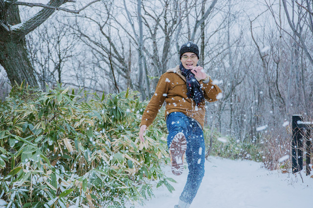 登别 地狱谷的后山上,游客比较少,一路上都是干净的积雪,我们当然就疯玩起来了,不过我说:嘿,你不能再吃了,不然下次我再也抱不动你了。