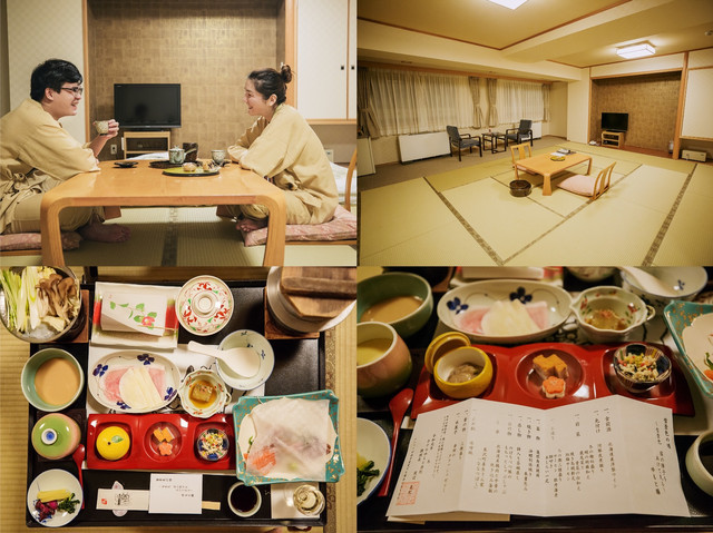 登别 的酒店选择非常多,出发前可是挑得我眼花缭乱。我建议可以从两方面去考虑:价格和温泉。首先看自己的预算,一分钱一分货,贵肯定有它的道理。而汤本温泉酒店的特色在于它的榻榻米房间,房间空间非常大,在 日本 来说可谓大得有点奢侈。我们订的是包含双份早,晚餐的,晚餐是酒店安排好餐食,按照你定的时间直接送到你的房间(6:00-7:30PM,6:30-8:00PM,7:00-8:30PM,7:30-9:00PM这四个时间段可选),吃完会有服务员过来收拾然后给你铺好床。餐食从照片可以看出来非常的精致,样式也非常多,味道还算不错,建议预定房间的时候一起预定晚餐。