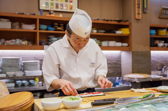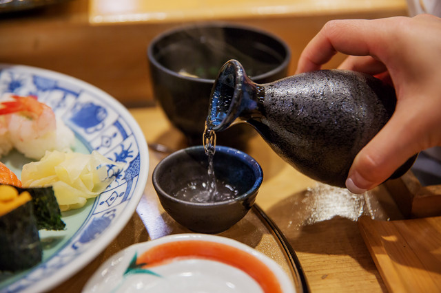 我们特意选了个吧台的位置坐下,虽然语言不通,但也只是好奇看看他们做寿司的全过程。入乡要随俗,寿司据说要配清酒,那就煮上一壶吧。
