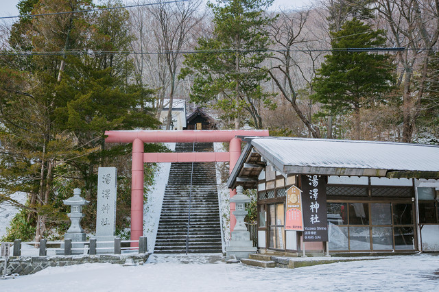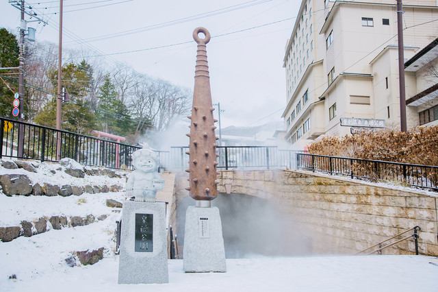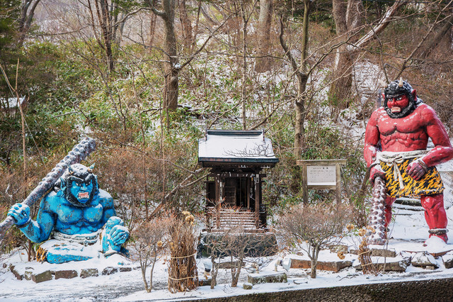 再往里走,就看到有一座神社和 登别 经典的红蓝鬼雕塑。虽然它们面目有点狰狞,但是 登别 这个地方,大街小巷都被各种形色的鬼怪雕塑所充斥,来到 登别 ,就仿佛来到了的鬼的家乡。