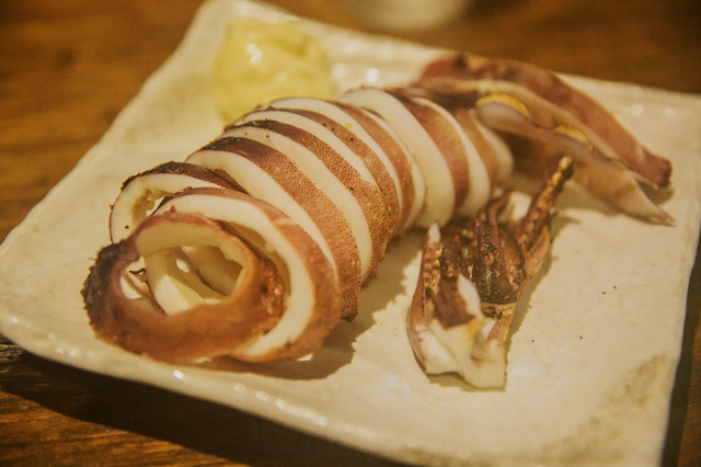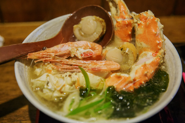 温泉小镇其实并不大,一条街直通到地狱谷。到酒店寄存好行李已经是下午1点多了,赶紧又找了家拉面馆填饱肚子。对于吃,我们都是认真的,昨天也是拉面,今天也是拉面,总得来点不一样吧,于是我们狠下心,点了一碗帝王蟹腿的海鲜拉面(差不多花了250RMB),味增的咸盖过了海鲜的鲜味,不推荐。不过后面那盘烤鱿鱼非常推荐,搭配 沙拉 酱竟然莫名的好吃。