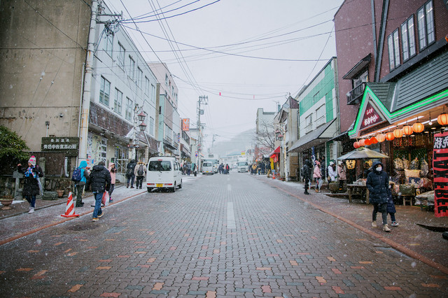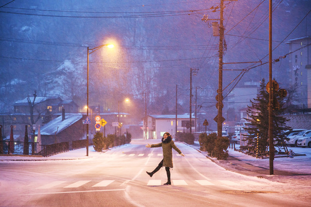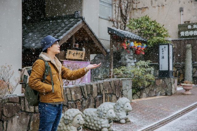 看来这场雪也是很多人期待着的,看,远处的小姐姐也来不及穿上点衣服就往外跑,真佩服她们的御寒能力。整个温泉小镇感觉一秒进入了冬季,刚才还清晰可见的石板路,一眨眼的功夫就铺满了白雪,嗯,这才是我要的感觉。