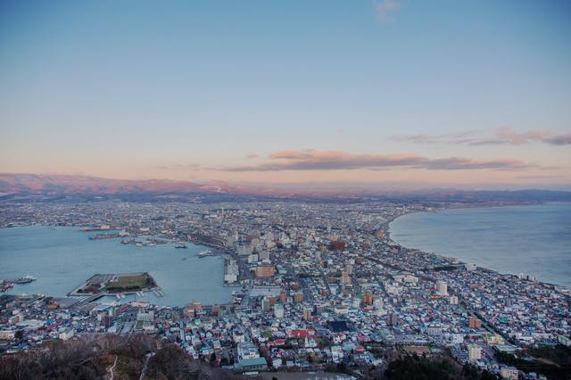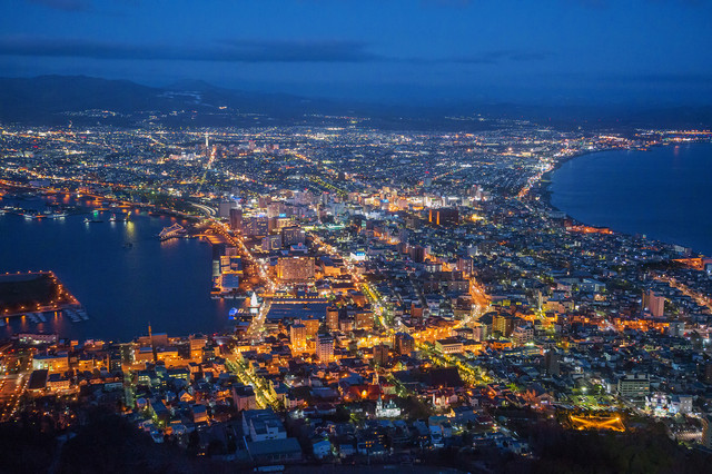 随着天色变暗,城市的灯慢慢亮起来,这个号称“世界三大夜景”之一的 函馆 夜景逐渐露出了它的真容。那一刻我就在感叹,幸好老天眷顾,昨天还是风雪交加,今天就大晴天,才让我们看到如此清澈绝美的夜景,值了,感恩!!