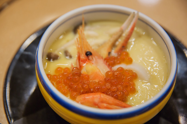 我们两眼一对,就知道彼此的意思了,毕竟都是吃货,双人份套餐先来一个,甜虾,三文鱼,海胆都是我们的最爱,海鲜控的我们再多来了一份海鲜刺身。 日本 料理从颜值上就能征服我们,这道三鲜蒸滑蛋(名字我瞎起的,具体忘记了,里面有一只虾,一个蟹钳和鱼子)看起来就让人食欲大增。