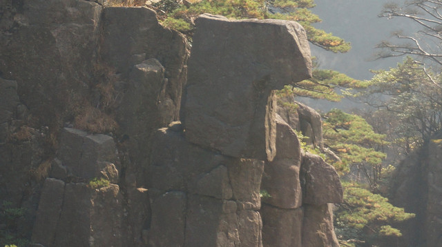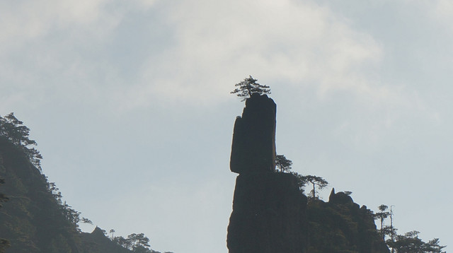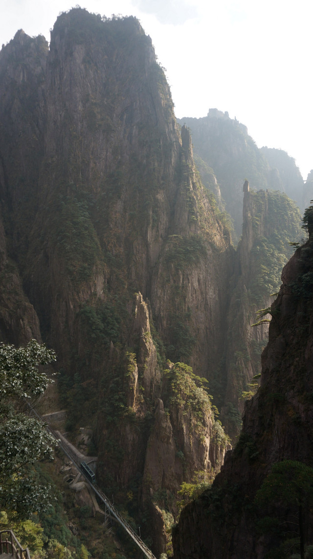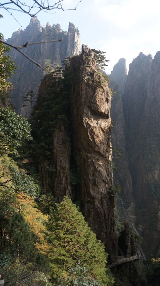 玉玺石就是照片中由左向右第三个岩峰尖尖上的那块石头,很小,有点牵强。峡谷底部的观光有轨缆车已经能看见了。