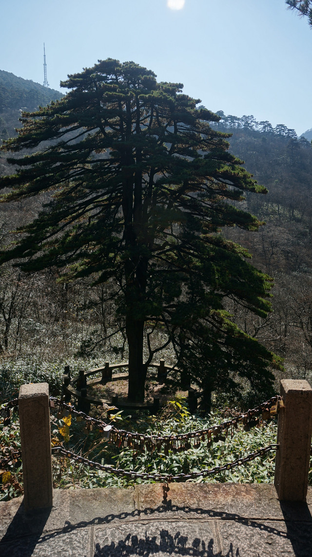 连理松为黄山十大名松之一,列入世界遗产名录。位于自“黑虎松”去“始信峰”途中左侧。树高20多米,在离地2米处树分两干,并蒂齐肩,其粗细高低几乎一模一样。因为人们常以连理比喻夫妻,所以附于此树的传说也是爱恨缠绵的唐明皇与杨贵妃的故事。相传二人曾于七夕明誓,百年之后同去黄山,修身养性再结连理。死后二人果然同游黄山,并留恋此地美景而化身为连理松。所以携手同游的恋人经由此树,都要在这里留影,让古树为幸福爱情作证。