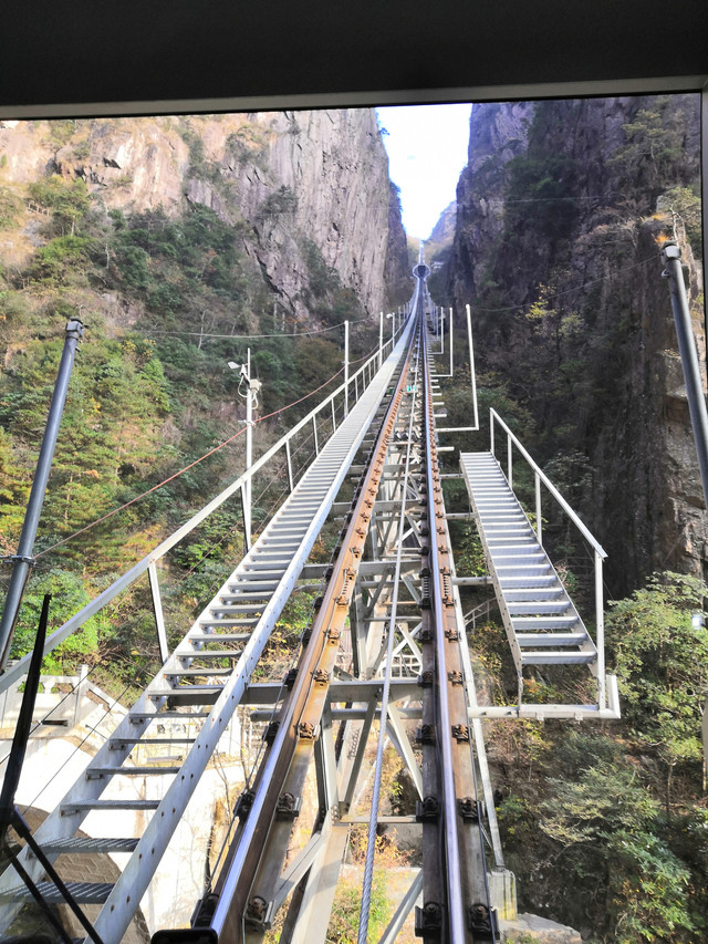 抵达西海大峡谷的底部,乘坐观光缆车上行。与其他缆车不同,西海大峡谷观光缆车并非悬挂在半空中,而是在铁轨上行驶的一列车厢,只是由钢缆牵引而已。