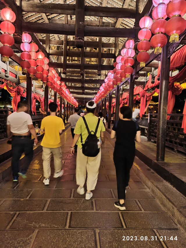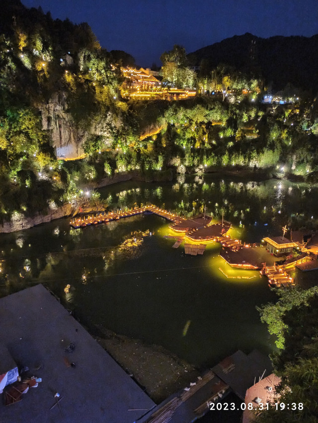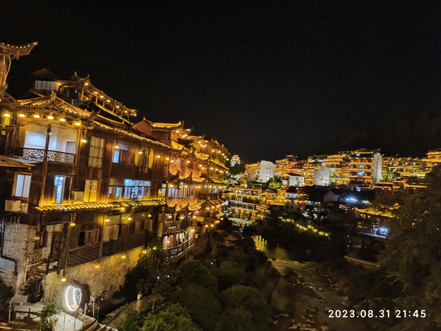 这里的建筑确如沈从文所写的那样是“傍山作屋,重重叠叠,如堆蒸糕”,但给我们的感觉并非是沈从文所说的“清而壮”,而是“美而幻”,大概是由于我们所见到的是灯光秀下的绚丽夜景吧。