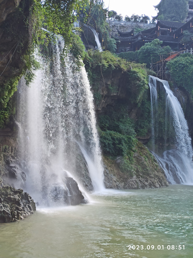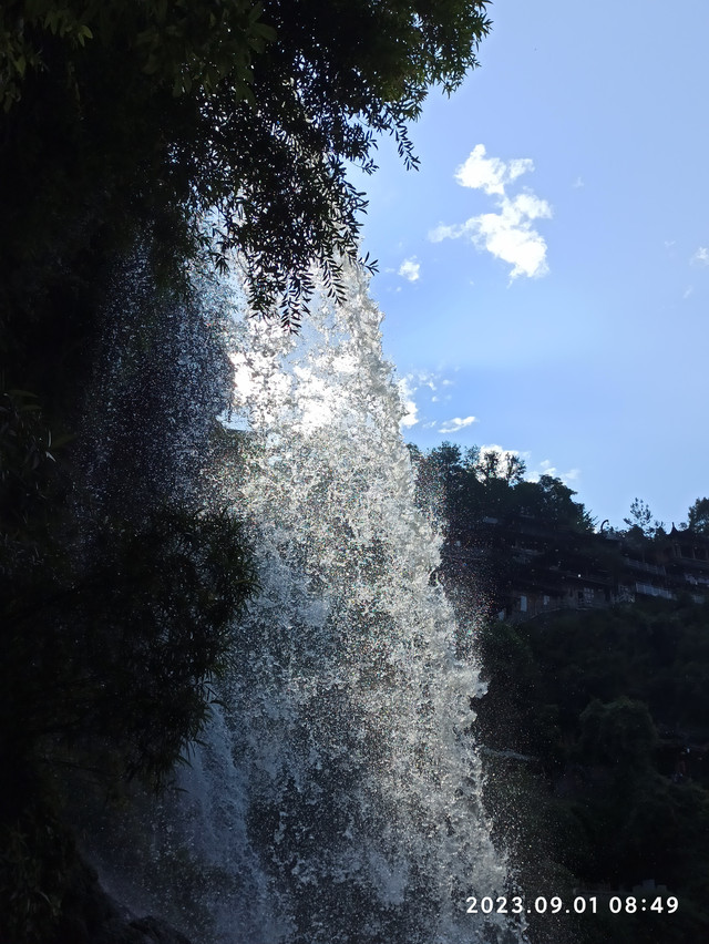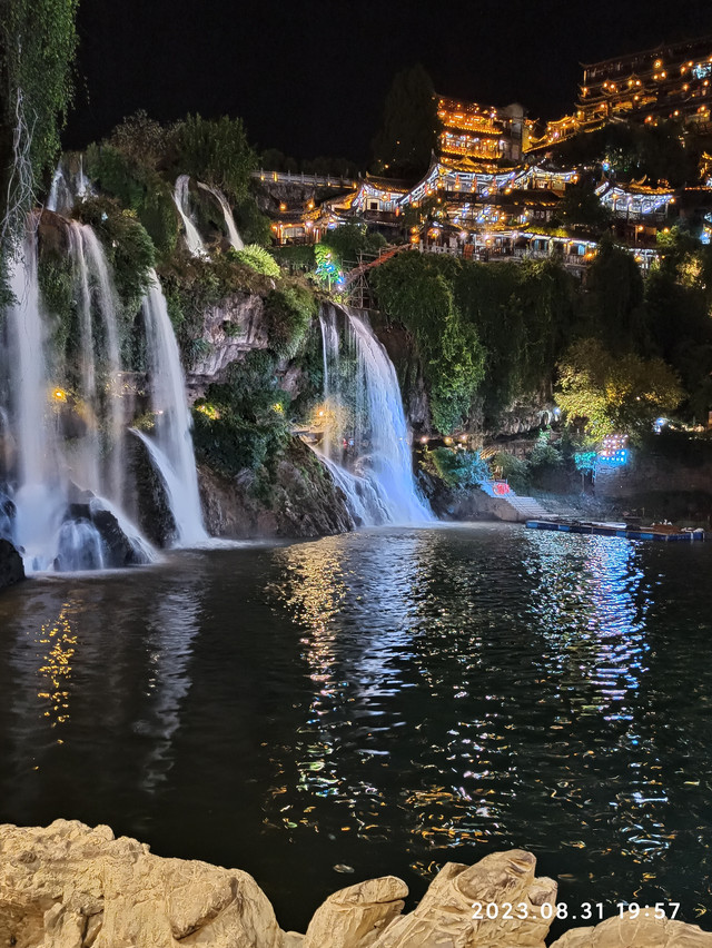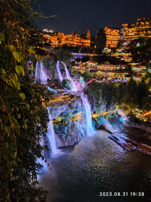 我们重点游玩了芙蓉镇大瀑布。这条瀑布穿镇而过,高约六十米,宽约四十米,分为两级:它先从最高处一跃而下,跌到一块平地上,形成第一级气势磅礴的瀑布;在平地上喘口气后,它再次积聚力量,从悬崖上拼尽全力向下一跃,毫不犹豫地扑进了几十米之下的酉水怀抱,发出震耳欲聋的声音,成为第二级夺人心魄的瀑布。瀑布的两边是层层叠叠的楼房,在灯光的映射下,瀑布如梦似幻,层楼金碧辉煌!