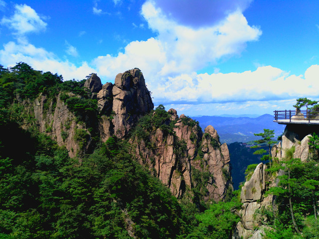 往长空栈道前进,发现这里的景色更美,山上的山风吹佛在身上真是舒爽,一路游览,蘑菇群、平衡石、仙人晒靴,青山、怪石、劲松、配上蓝天白云,构成一幅和谐的画卷,让人感叹祖国的大好河山,这里有一点,在栈道旁边的树,枝丫往外斜长到栈道上时,我发现在1米6左右的高度上会绑上一段麻绳,我的理解就是为了防止游客的头装上所以绑上的,不知道对不对,如果是的话那花台的管理真的很人性。唯一可惜的是没有看到石佛,没有提醒,一圈下来,就到了花台索道的上部站,大概2.5小时的脚程。