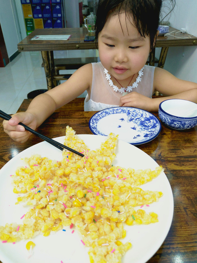 晚饭在酒店后面的柯村美食一条街上吃的,点了当地特色的蕨菜炒肉、九华一绝(蘑菇、黄精、竹笋汤),还有玉米烙,女儿说玉米烙太甜