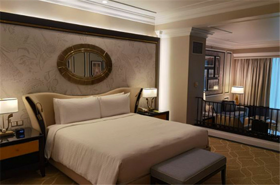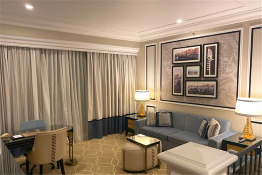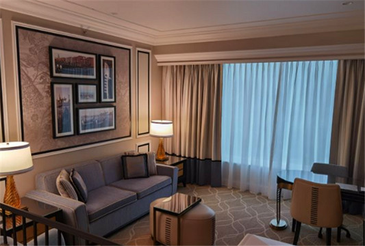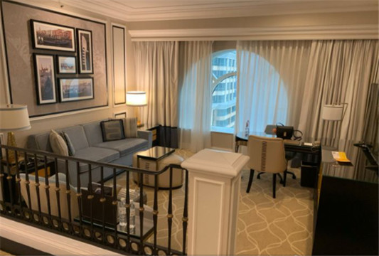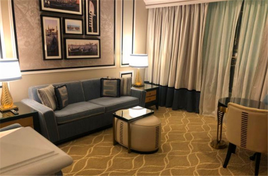 70平米的超大空间,一个人住居然觉得空旷,这可是寸土寸金的澳门!一张特大床,对于睡觉很不老实的我也是很适合的,房间的设计很有现代风,房间里还放了不少小城威尼斯的画作,很有韵味。会客区、卧室、洗手间三个空间分离,会客区占了房间的1/3位置,与睡眠区通过是下沉式的设计隔开,错落有致。沙发、餐桌等一应俱全,想怎么用就怎么用,完全被打造成了理想居住空间的样子,可以像在家一样无拘无束,宾致如归大体就是这样吧。