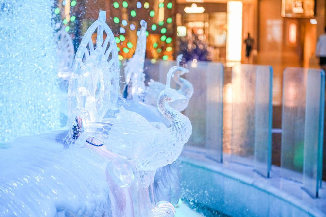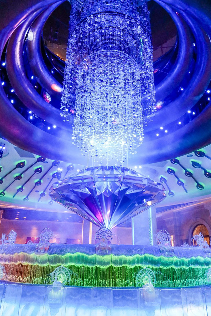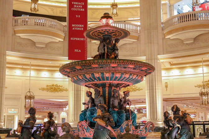 这里的喷水池中央,就是一颗巨大的钻石,在这里的墙上,雕塑上,如果仔细看,都能发现钻石的装饰,各种钻石饰品在这里的灯光照射下,折射出璀璨的光彩,走在其中,确实很有一种被钻石包围的感觉。
