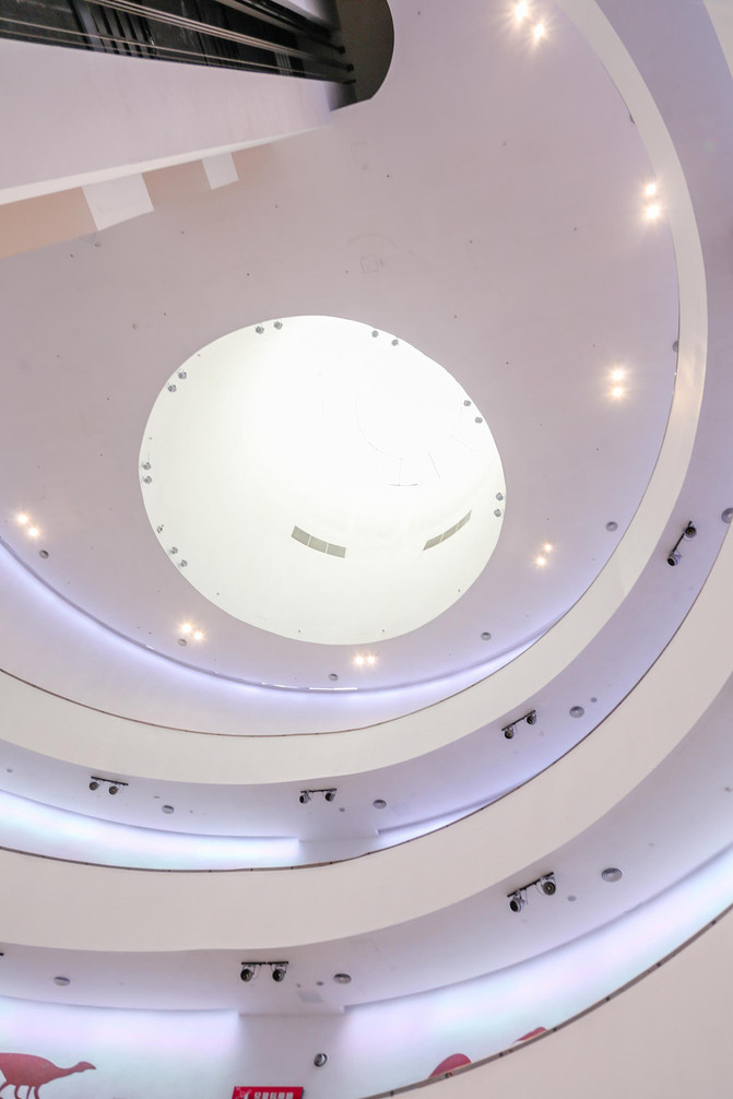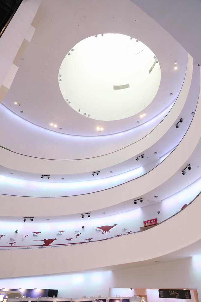 走入科学馆内,是一个颇为干净而充满科学感的空间。数层楼的高度并没有那传统的楼层设计,中间空着,能直接看到天幕的设计非常别致。