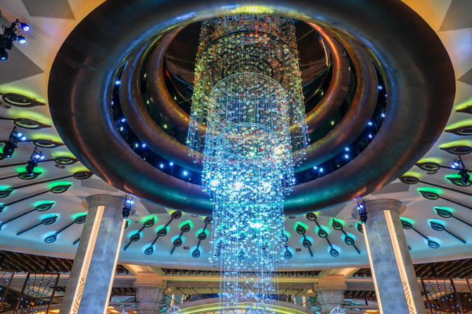 傍晚回到了氹仔的银河酒店,银河酒店作为澳门的又一家豪华型酒店,这里大堂的设计也极具特色的艺术风情。