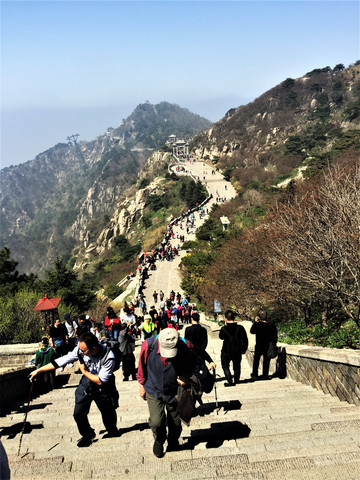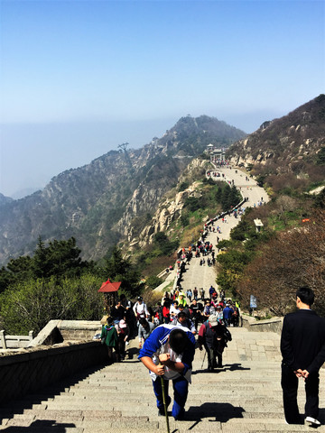 天街到玉皇顶整体坡度逐渐增大特别是冲顶那一段费点力气,我们每人都携带了登山杖很实用建议做好准备,到山顶上人就比较集中了,“五岳独尊”的石柱前照相基本是大合唱只好放弃了,也难怪大家好不容易登上来了都想留下美好的瞬间。先生说40年前上大学的时候和同学从北京坐绿皮车来爬泰山,登顶还要熬半宿等着看日出真是青春的慨叹。现在的感觉一是没体力挺了,二是看日出也不那么执着只此一地了,尽管泰山观日曾经或依然吸引了无数人,还是那句话景其次意在先。