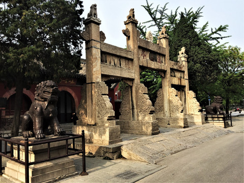 奇异的古槐树、柏树相对集中在两个大院落观赏性也很强,其实整个岱庙都掩映在参天大树中。碑刻如林是岱庙的历史渊源,形状不一触目皆是,最珍贵的秦代李斯小篆碑刻于公元前209年,见证着岱庙的厚重久远和它的地位。明朝嘉靖年间铸造的铁塔与铜亭对称而立,铁塔原有13级后因日军轰炸泰安时被毁尚存3级,嘉靖年间留下了很多与祭祀祭天有关的遗迹,亦如北京的天地日月坛等。