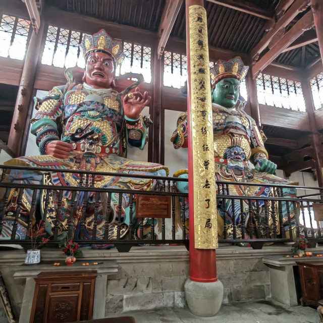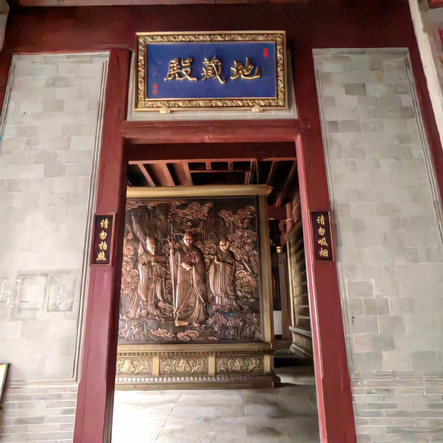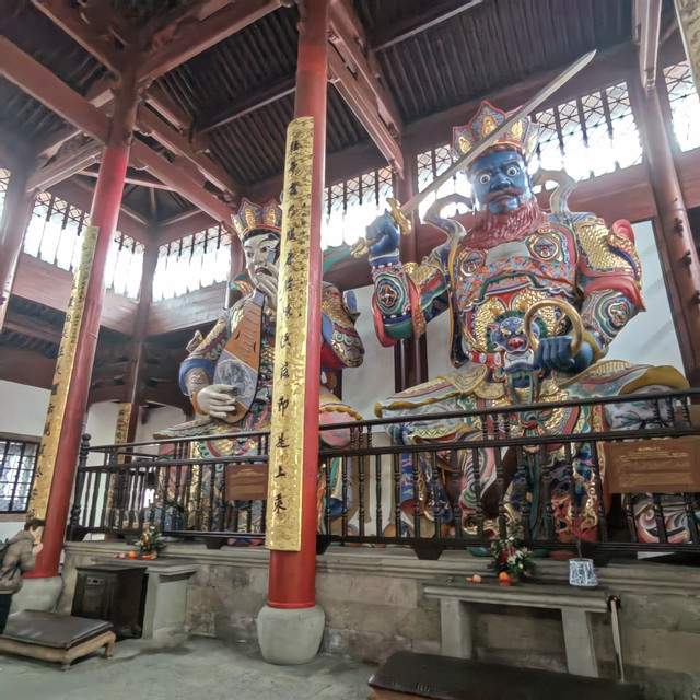 天王殿正门供养弥勒菩萨,许合家平安愿;反面供养韦驮菩萨,许家宅平安,出入平安愿。韦陀菩萨—背靠弥勒佛、手持降魔杵,面朝大雄宝殿的佛祖。按佛教寺院规矩,韦陀面朝大雄宝殿的释迦牟尼,意为持法护法,驱除邪魔。他常在东、西、南三洲巡游,守护佛法,故称“三洲感应”,是寺庙的守护神。天王殿系明崇祯8年(1635年)重建,现天王殿系民国25年1936年重建。