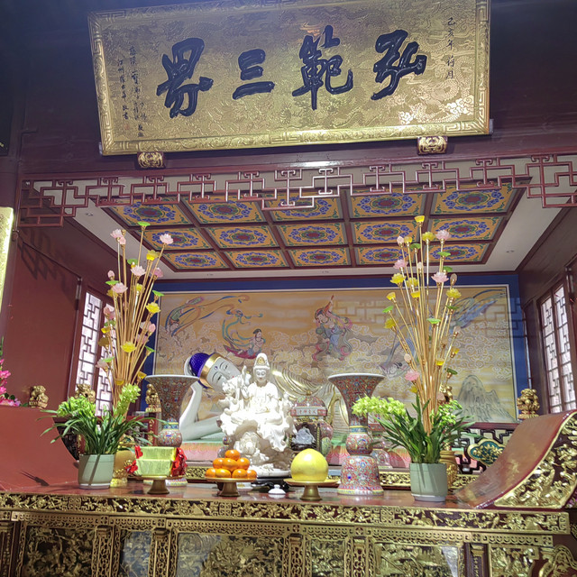 佛殿中央供养佛祖释迦牟尼、药师佛和阿弥陀佛,代表东、中、西三方空间世界,故称“横三世佛”。右面的药师佛人们称他为消灾延寿药师琉璃光佛。左面的这尊佛是西方极乐世界净土门之教主的阿弥陀佛。大殿两侧为十八罗汉。三世佛背后为海岛观音,是以童子拜观音为主体的“五十三参”海岛立体彩色群塑,塑造了神态各异的大小佛像150尊。