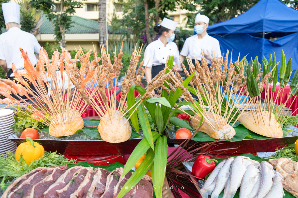 每晚在这块巨大的草坪上都会有户外BBQ!可以自由挑选自己喜欢的美味海鲜、肉串、蔬菜等等…还有适合小月龄小朋友吃的米粥和清汤面,不要担心自己宝宝太小没得吃。
