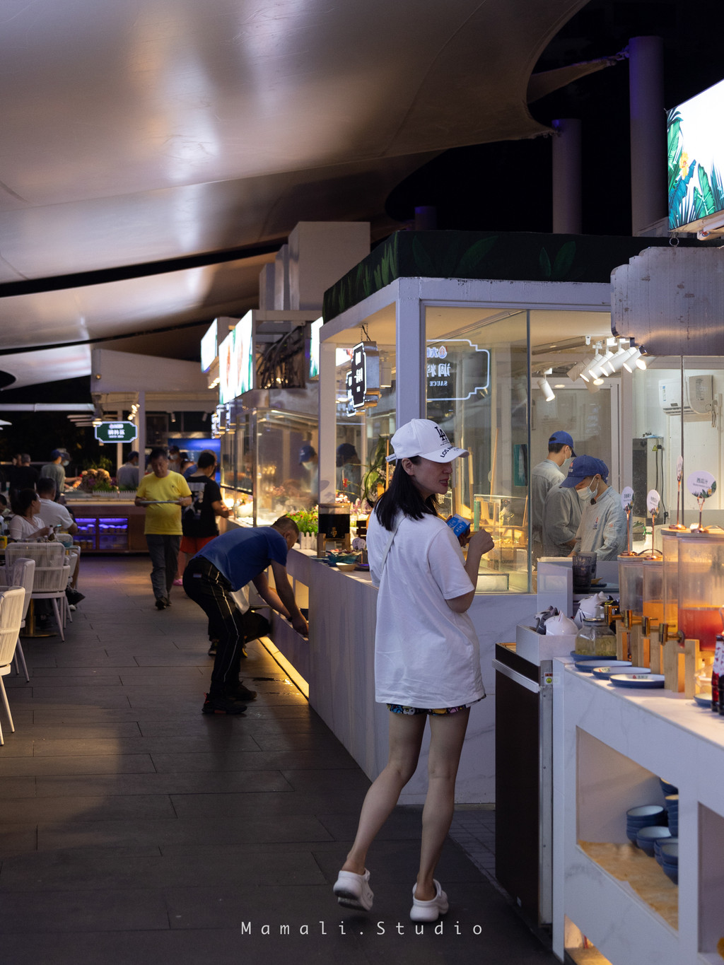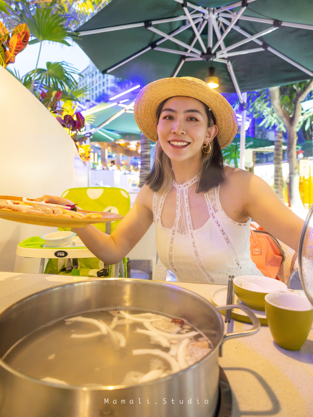 大悦洋的雨林餐厅,就像名字里提及的那样,是户外雨林风格,大片的植物环绕身旁,白色的桌椅浪漫至极,夜晚还有缤纷的小灯点缀,非常美丽。