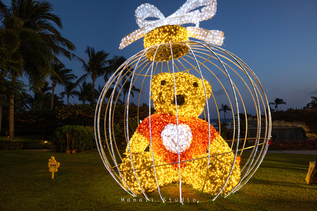 酒店的网红打卡地——超大只的礼物熊不要错过,与它拍照也可以可可爱爱,晚上的时候它的灯就会亮起,更是浪漫至极。