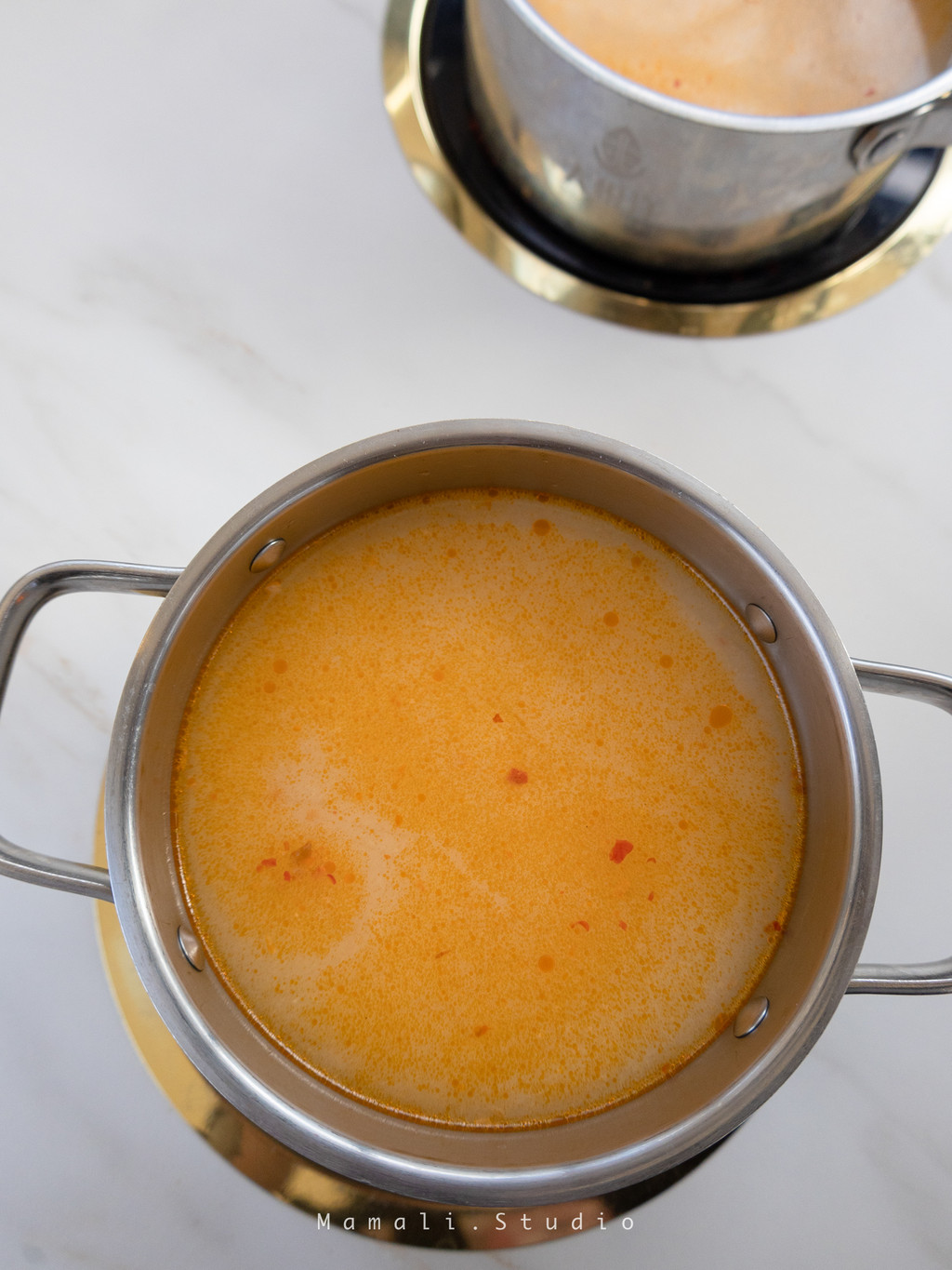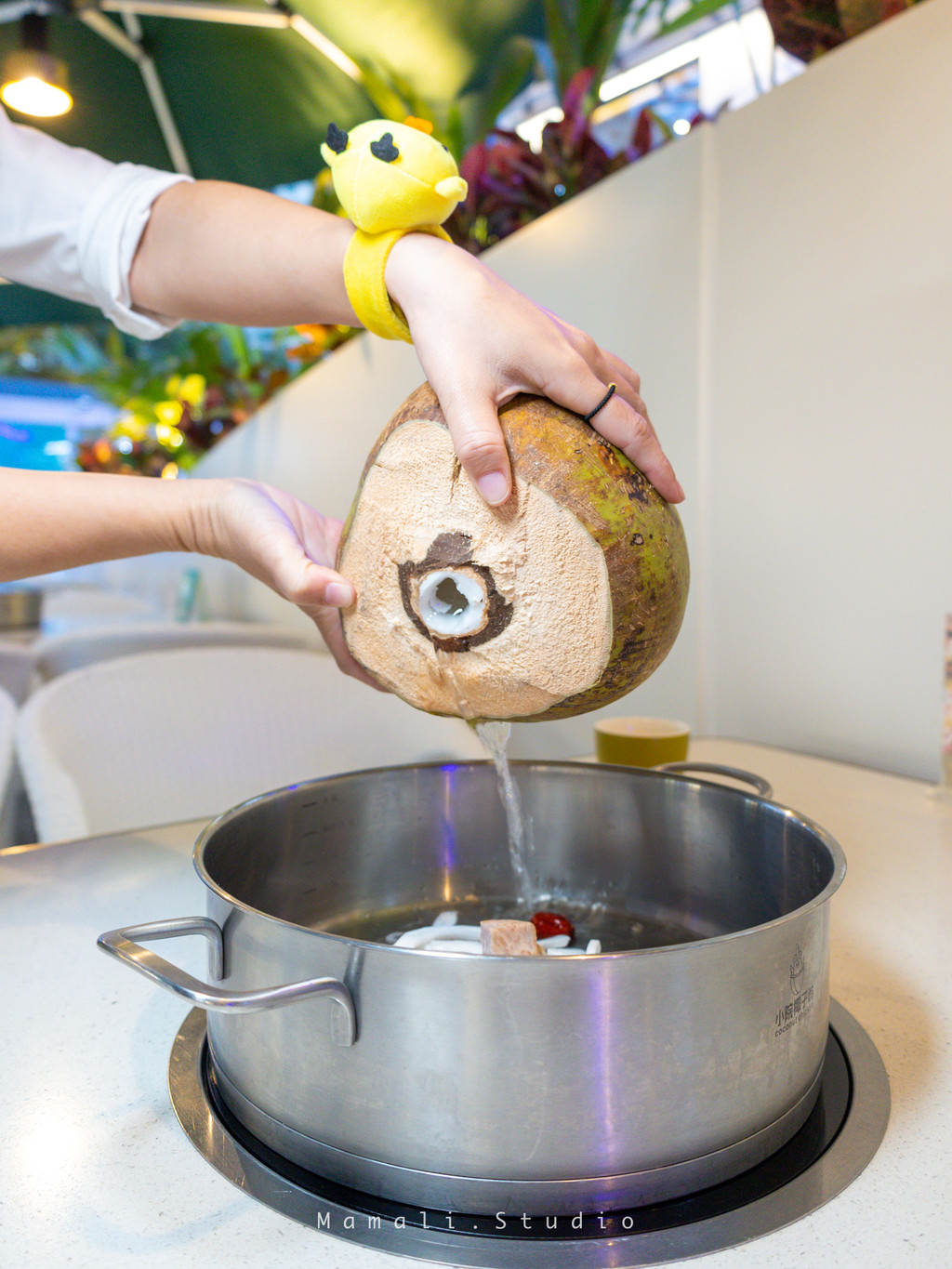 这家店一进门的地方,会看到砍椰子的小哥在辛勤的工作,可以看到每只椰子都是足够新鲜的。所以,当三只椰子倒进锅的时候,就是它们的“最佳状态”。