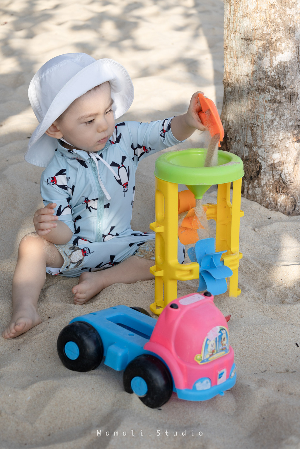 当然,他最爱的项目依旧是挖沙子了。酒店免费的挖沙玩具,省去了老母亲们长途携带的烦恼,我家KK第一次玩这种沙子风车,简直是入迷了,连续玩了三天,每天都要去挖一会。