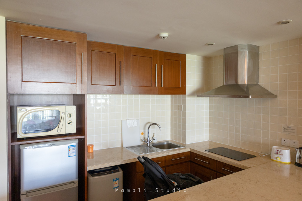 我们定的房间位于酒店的二区,是一个带厨房的家庭房。客厅有一张床,主卧有一张床,可以容纳至少四个人住,因为我们是带着KK的奶奶一起来的,住起来非常方便。