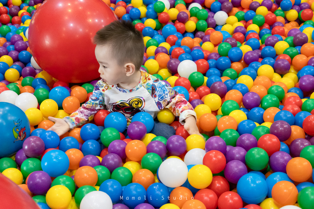 大大的泡泡球池配套有滑梯、攀爬网等等。KK最爱的是玩球,他一个人承包了一整个彩球池子,玩得不亦乐乎。