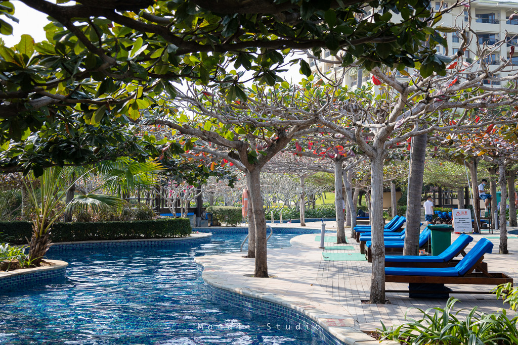 同时泳池旁边种植的树木像一把把绿色的大伞一样,几乎把天域泳池给覆盖了起来,不仅凉爽还免太阳曝晒!