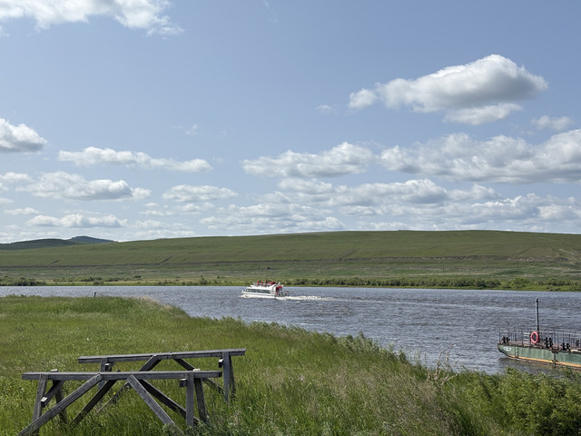 我们踏上界河游船,河水清澈如碧玉,船行水上,如镜面被划开,涟漪扩散,牵动着两岸的风景。左岸是中国的蒙兀室韦,绿草茵茵;右岸,俄罗斯的异国风情,彩色小屋点缀在起伏的草坡之上,一片宁静安详。原来一道水波,竟能如此清晰地划开两片土地、两种生活。“一河分两国”,这份壮丽与微妙,只有在亲身体验时才能感受到。船行至中俄友谊桥附近,那座横跨河上的桥梁显得格外醒目,连接着两岸,也连接着两国人民的情谊。