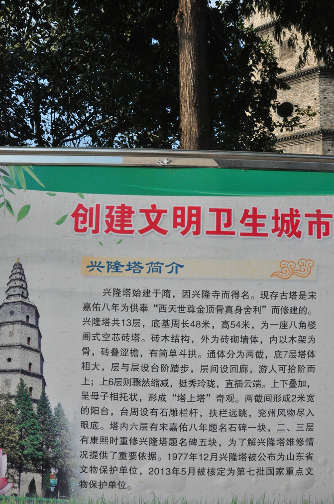 兖州博物馆虽然毫无名气,但是小小的展馆却也有国内少有独到的珍品,的确值得一觑。另外与之毗邻的兴隆塔屹立千年,至今古风犹存,让人侧目。兴隆塔为砖木结构,始建于隋仁寿二年(602),后历代重修,共13层,高54米,为八角楼阁式空芯子母塔。在塔的周围,还陈列了历代的碑刻石雕,供人观赏。