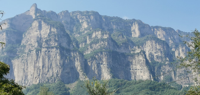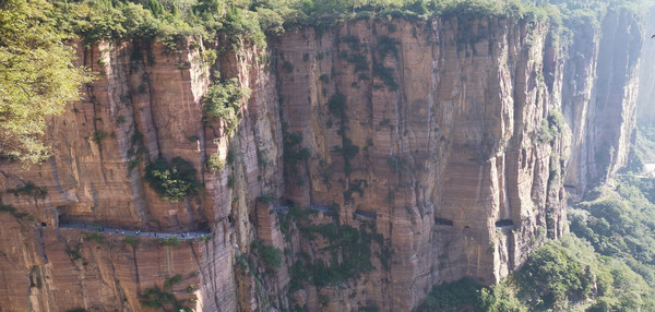 远处可见穿行崖壁上的公路。
