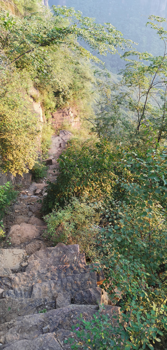 在绝壁公路未修之前,这里的人们都是通过天梯来往交通,我们站在天梯口的上端,只能看到下行的路口。看到路边介绍说,天梯高达百米,有720级台阶,梯势险峻,蜿蜒曲折,最宽1.2米,窄处仅0.4米,稍不留神就有坠崖之险。始建于明代,是郭亮村通向山外的必经之道。