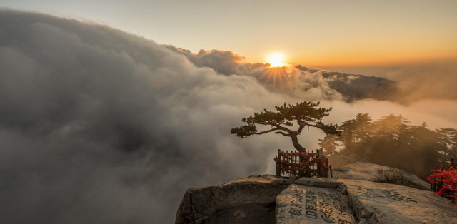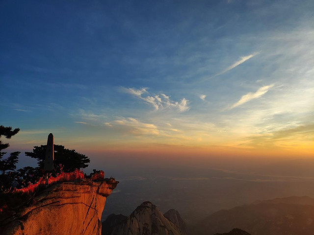 我们在中峰看日出的时候,天气特别不好,只能看见远处天边有点点的霞光,太阳一直出不来,云层太厚。大概在快中午太阳就完全出来了,我站在南峰石碑旁照相的时候,眼睛都睁不开,游客也越来越多,这些游客基本都是从西峰坐索道上来的,有些是赶着去北峰坐索道下山,有些人则是就在西峰,南峰走完就下山。